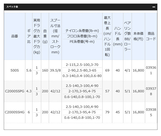 スペック ●品番:C2000SSHG●ギア比:6●実用ドラグ力(kg):1●最大ドラグ力(kg):3 ●自重(g):200●スプール寸法(径mm/ストロークmm):42/12●フロロ糸巻量(lb-m):2-170,3-95,4-75 ●PE糸巻量(号-m):0.6-140,0.8-100,1-70●最大巻上長(cm/ハンドル1回転):79●ハンドル長(mm):45 ●ベアリング数(BB/ローラー):5/1 関連商品 シマノ ソアレ (リール) シマノ ソアレ (ロッド) 在庫について マルニシ楽天ショップにて掲載、販売しております商品は実店舗と在庫を共有しているため、 「在庫有り」の場合でもご注文後に欠品が発生する場合がございます。